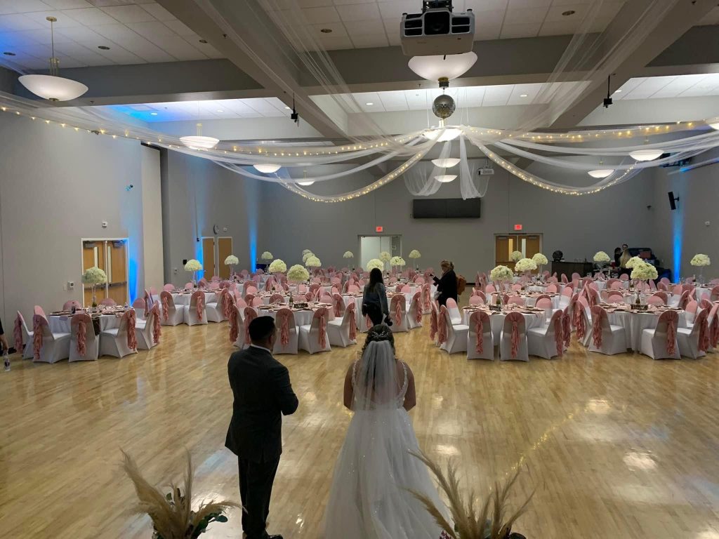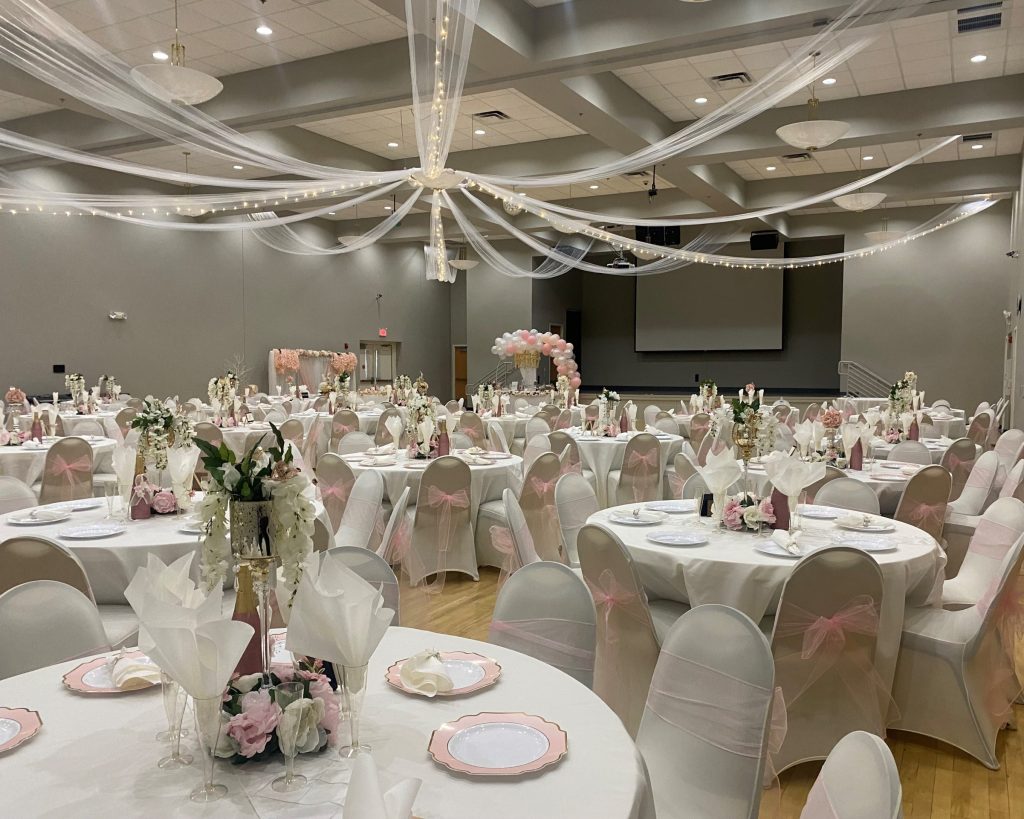 Our full ballroom accommodates up to 400 guests theater-style or 600 for a reception. Features include a premium wood dance floor, audio/visual equipment, prep kitchen access, tables and chairs, house tablecloths, and same-day decorating.