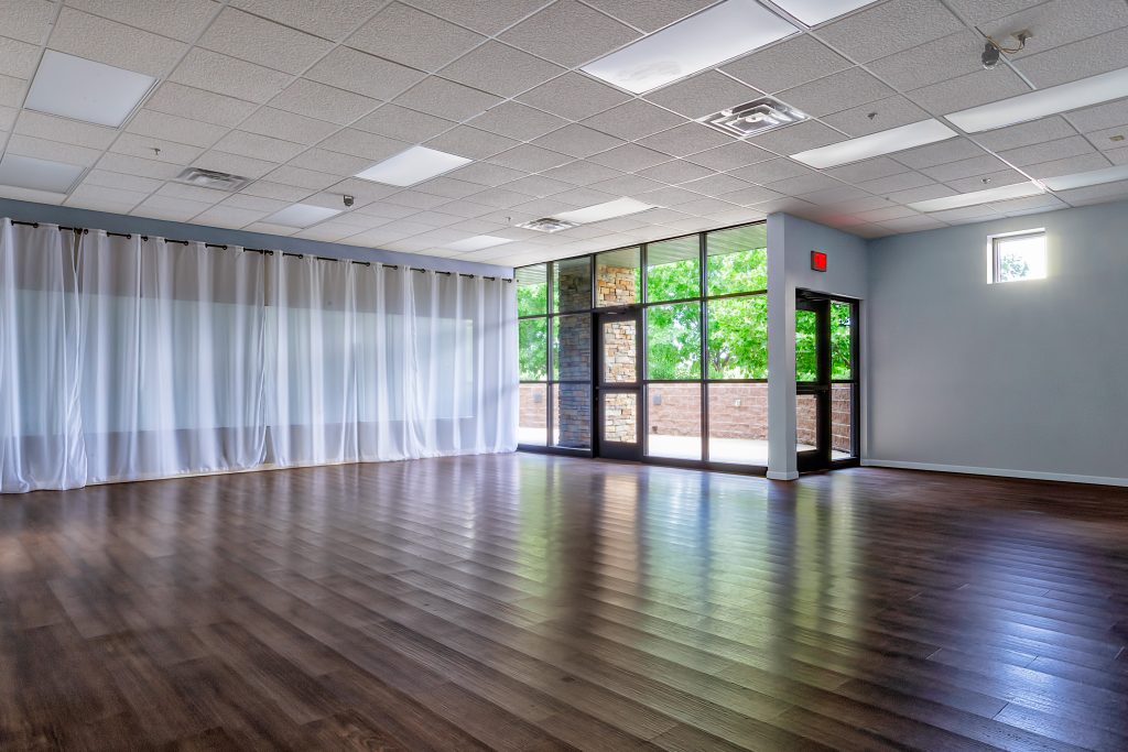 A bright, versatile space with floor-to-ceiling windows, the Studio is perfect for dance classes, smaller receptions, meetings, and private events. Includes tables and chairs, sound system, house tablecloths, and ample parking.